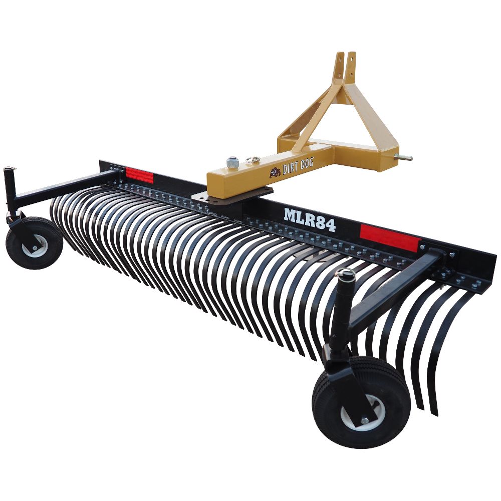 The MLR heavy-duty landscape rake is built for leveling, grading, and clearing debris with tractors up to 60 HP. With adjustable raking angles, it windrows material, spreads gravel, and smooths surfaces with precision across property maintenance and site prep applications. A heavy-duty frame and heat-treated spring steel tines deliver durability and long service life, while optional gauge wheels provide added control for consistent results across varying terrain.