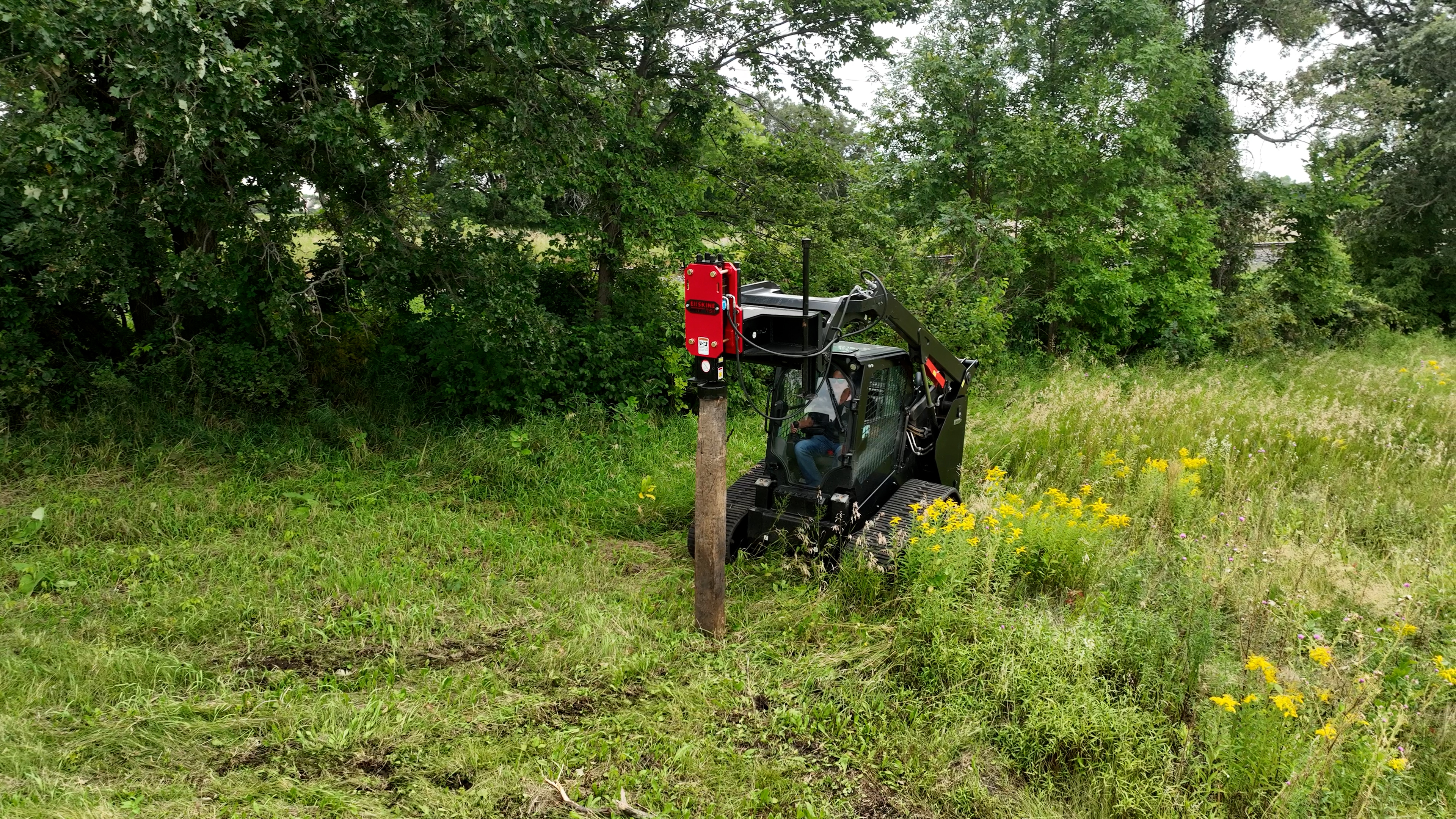 The Hammer-Style Post Driver is built on proven hydraulic breaker technology to deliver powerful, consistent impact for larger post installations. Designed for skid steer maneuverability, it easily works around buildings, trees, and obstacles while requiring minimal hydraulic power. Operating on a minimum of 12 GPM, it can drive 8" to 9" posts into the ground in under 15 seconds, making it ideal for heavy-duty fencing and structural applications.